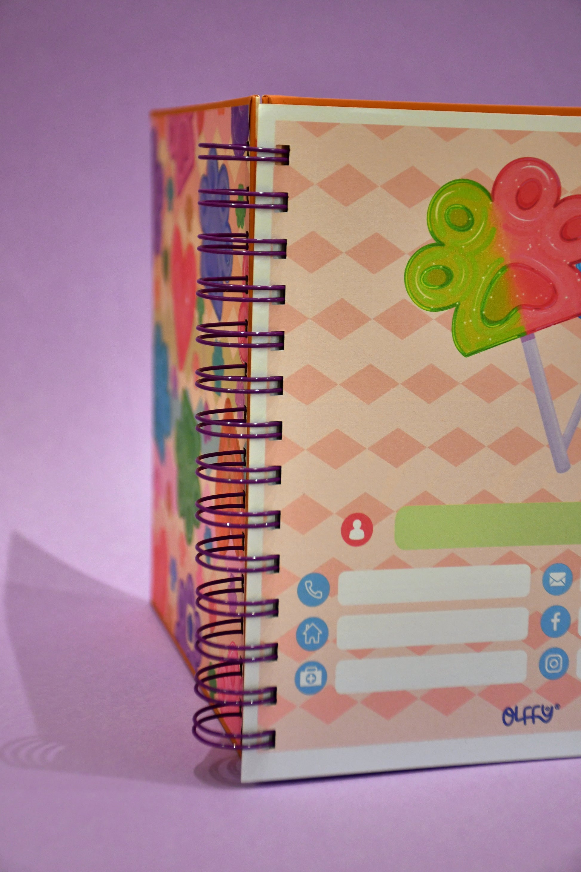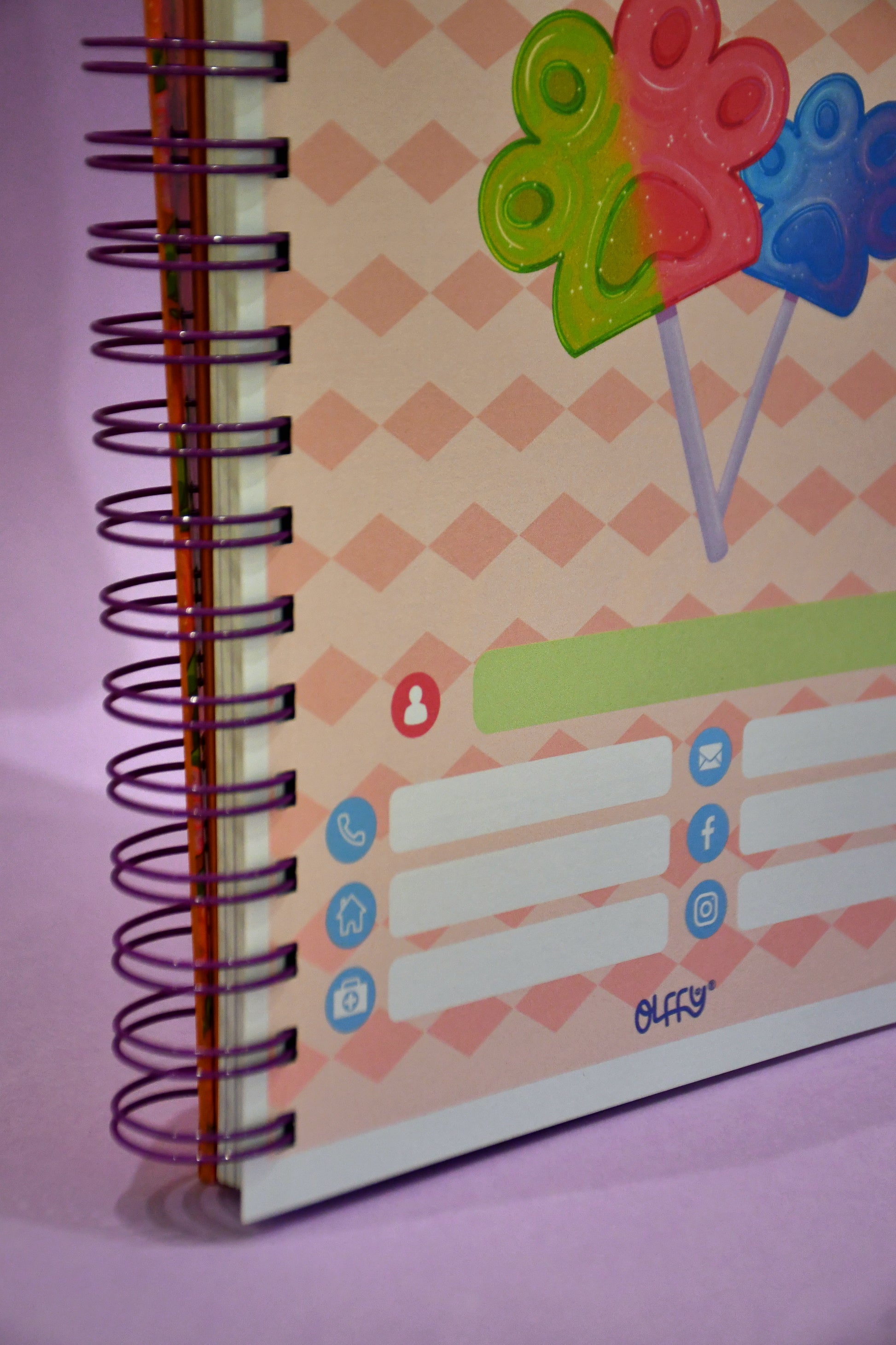 Este cuaderno está inspirado en una pequeña dulcería Olffy, donde todo es color, ternura y detalles que sacan sonrisas. Entre sus ilustraciones aparecen paletitas, dulcesitos y golosinas con un guiño especial: muchas tienen forma de patita de perrito, mezclando lo dulce con lo adorable.