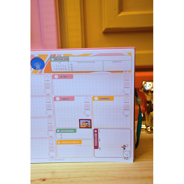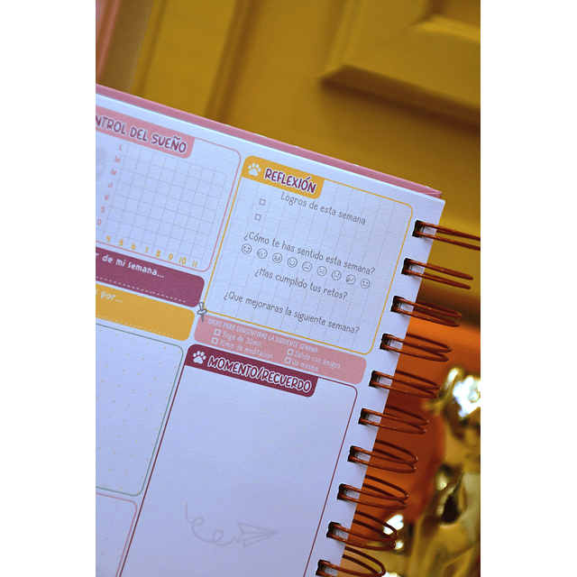 Además incluye una sección de revisión de tu semana, con preguntas personales y de control de hábitos.